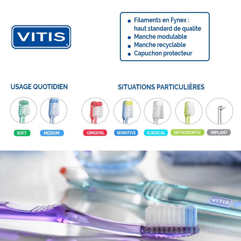 La brosse à dents VITIS Gingival est recommandée par les dentistes pour une hygiène bucco-dentaire optimale et un respect des gencives sensibles.