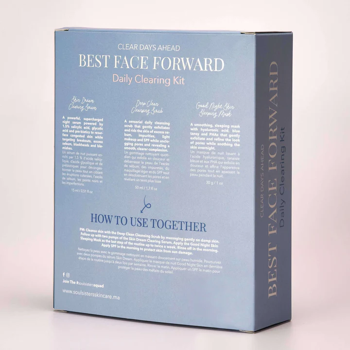 Découvrez notre ensemble Best Face Forward, conçu pour révéler la meilleure version de votre peau. Cet ensemble comprend un Gommage Nettoyant Anti-Imperfections de 50ml, un Sérum Anti-Imperfection de 15ml, et un Masque de Nuit Lissant de 30g. Chacun de ces produits a été minutieusement formulé pour cibler les imperfections et promouvoir une peau éclatante et saine.